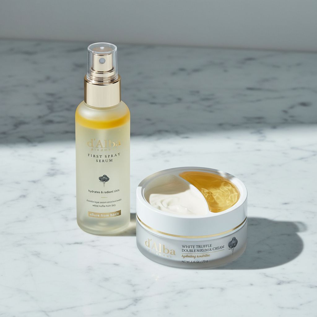 - Enfoque de set: d’alba First Spray Serum con Trufas Blancas + d’alba Crema y suero doble de trufa blanca facilita mantener una misma línea de productos dentro de la rutina.