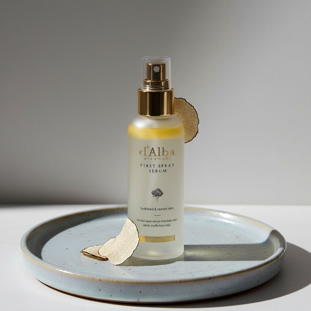 - d’alba First Spray Serum con Trufas Blancas Italianas destaca por su enfoque de “sérum en bruma” para simplificar la reaplicación durante el día.